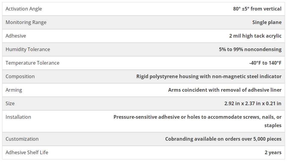 The TiltWatch® XTR is single-use tip indicator used to monitor goods that must remain upright. Once applied to the packaging, the TiltWatch XTR will provide evidence of mishandling if the shipment is tipped. However, the tilt indicator remains unaffected by movement resulting from normal handling conditions.